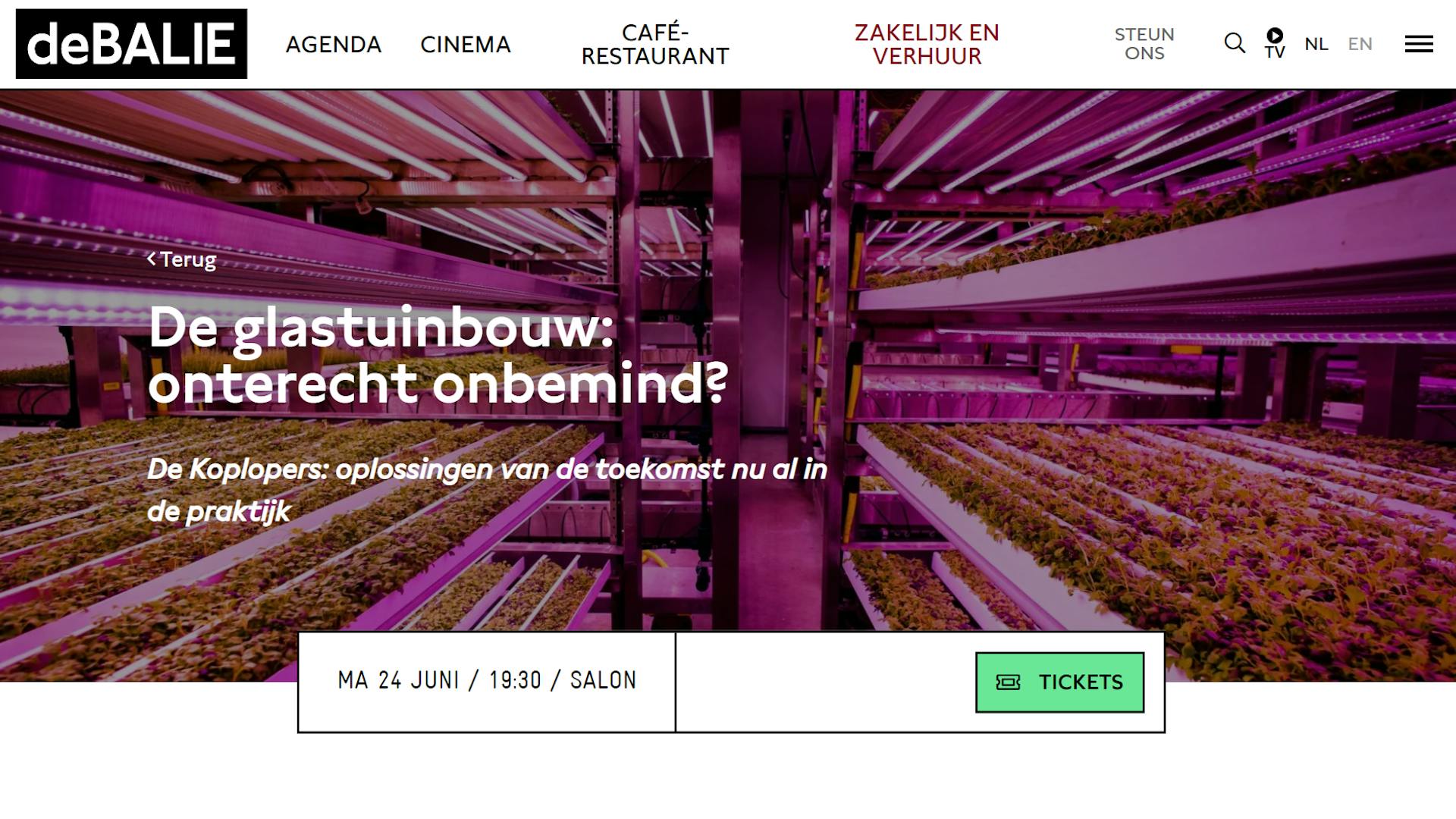 Van Bergen Kolpa presenteert en neemt deel aan debat over de toekomst van de Glastuinbouw in de Balie Amsterdam gemodereerd door Teun van de Keuken en Kees Foekema. Tickets en info>